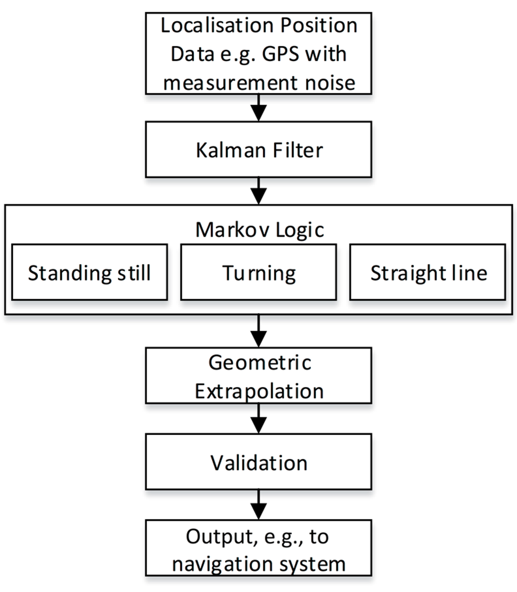 A low-cost mobile device provides positional data (GPS) about the target user (e.g., a sportsperson) as the input to the algorithm. Measurement noise is part of the location coordinates, and a Kalman filter is used to give a better representation of human movement and true position. Markov logic is then applied using previous data points to determine the navigational behaviour of the user at each time interval. During initialisation, a number of assumptions are made in order to populate state transition and emission tables; however, as data are collected, the algorithm is able to update these based on the distributions of newly-sampled data. The algorithm was designed to recognise some of the major states of a user’s movement at any given time. These states were defined as stationary , linear navigation and non-linear navigation . Depending on the maximum likelihood case , a different algorithm was used to predict a future location taking into account this previous behavioural assumption. Once a state was assigned to the motion of the user, a least-squares regression was implemented for the best fit and to enable extrapolation of the collected points to a possible prediction solution. The Haversine formula was implemented to determine the predicted GPS location based on the subject’s expected relative displacement. The algorithm could then output a predicted GPS coordinate that could be validated to ensure it was within reasonable distance to the user’s previous position. This was implemented by performing a vector magnitude calculation and comparing the result of this to a user-defined maximum travel distance, relative to the most recent target localisation. This is done to ensure that as target velocity increases, predicted positions and resultant UAS displacement does not exceed the range of the telemetry devices being used, and it also helps to enforce sensible predictions. Upon passing this validation, the GPS location is output for external use, for example to a navigation system of an autopilot.