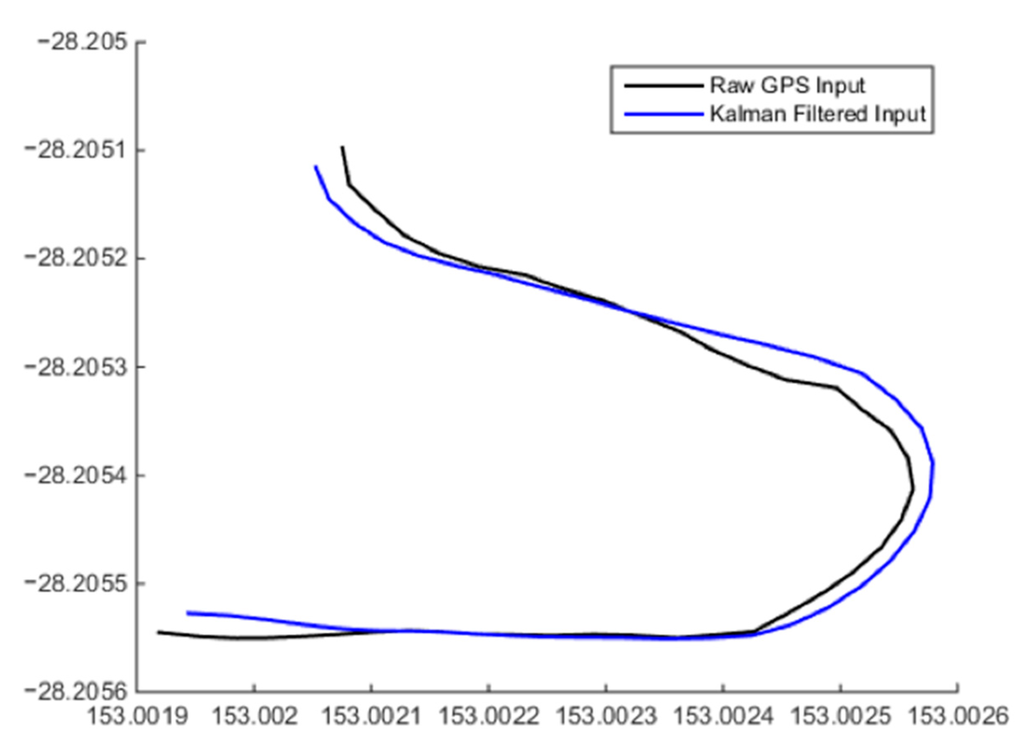Low-cost GPS receivers generally exhibit a high quantisation error that degrades the accuracy of readings [24]. On the scale of low-cost UAS navigation, the positional accuracy of these systems needs to be as high as possible to allow safe operation of the system. Through the use of a Kalman filter, the precision of these input positional estimates from low-cost GPS receivers can be increased to give a better representation of human movement without significantly increasing the cost of the system, as shown in Figure 2.