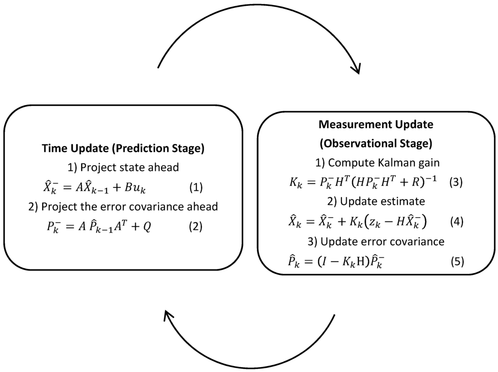 The second phase of the filter takes into account the measurement inputs of the system to produce a state estimate by correcting the predicted state and covariance estimates from the first phase of the filter. This is done by first computing the Kalman gain (Equation (3)), then correcting both the state estimates and covariance matrix (Equations (6) and (7)) [24,25].