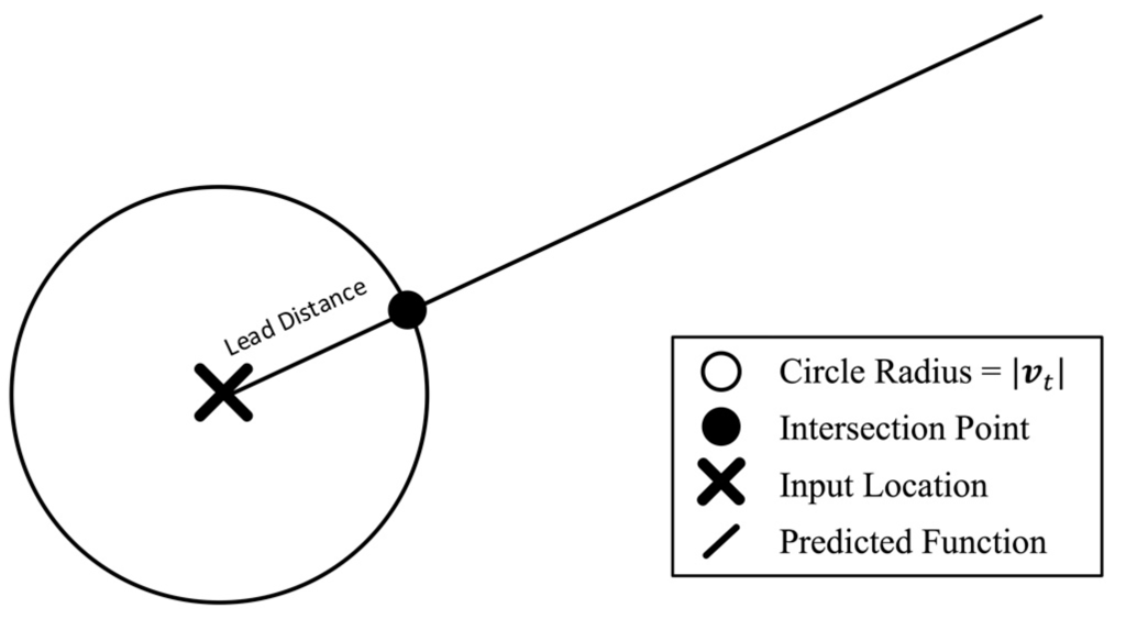 Locating the next GPS point using the intersection of the circle with the predicted function, where the circle has a radius equal to the desired lead distance.