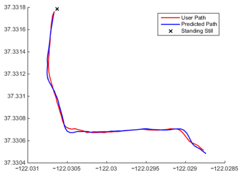 The prediction algorithm was tested over a small jogging track of approximately 270 m and 1.5 min. Figure 10 shows an example result. The solid blue line represents the path marked out for testing. The blue circles are the route taken by the user as seen from the iPhone. The red crosses are the predicted path by the algorithm output to the UAS, and finally, the black line is the path taken by the UAS.