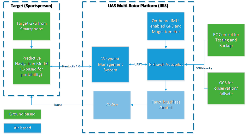 A GoPro camera and a Tarot 2D gimbal were mechanically attached to the external shell of the multirotor to enable filming. To ensure that the application was able to communicate with the UAS, Bluetooth capabilities of the iPhone were utilised for micro air vehicle communication (MAVLINK) protocol implementation. A Bluetooth 4.0-based telemetry radio was developed and connected to the Pixhawk flight controller to complete this communication system. It should be noted that for testing and failsafe purposes, a multi-telemetry approach was maintained; Bluetooth was the primary data link technology, and a remote control (RC) and laptop-based GCS connected over 915 MHz were used for redundancy purposes.