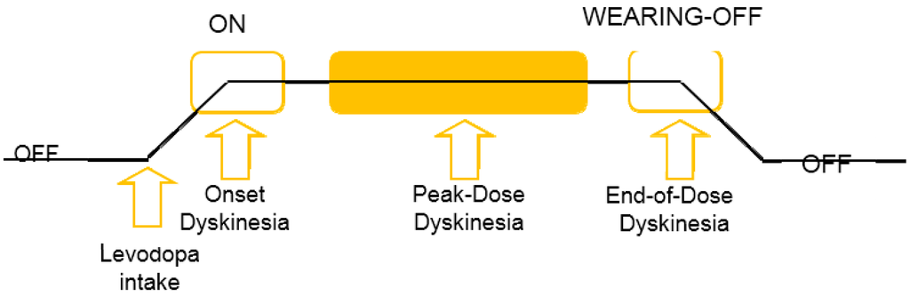 Usually, levodopa, which has been the most successful medication in reducing Parkinsonian symptoms, is prescribed to these patients for eliminating the typical symptoms of PD. This therapy is effective during the initial stages of PD. Yet, in the PD’s later stage, PWP have developed motor difficulties that include sudden loss of efficiency of the medicine during the end of each treatment break, wearing off and uncontrolled hyperkinetic actions denoted as dyskinesia [,,]. These variations are referred as motor fluctuations by the clinicians as shown in Figure 1. Many PWP start to fluctuate between the “off” state (i.e., re-emergence of PD symptoms due to the effect of levodopa wears off a few hours after levodopa intake) and the “on” state (i.e., levodopa is active and improves the patients’ motor performance). While, in the “on” state, patients had chances to suffer from dyskinesia. The presence of dyskinesia is a side effect of levodopa therapy and therefore denoted as levodopa-induced dyskinesia (LID) [,].