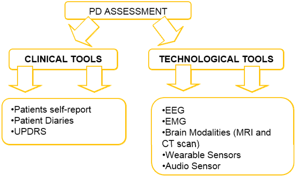 To ensure that these patients are able to be self-independent, clinician’s in-charge must have a precise picture of how the PWP symptoms will fluctuate throughout their everyday activities by optimally adjusting the medications. With the latest advancement in healthcare technology, techniques for PD symptom severity detection and assessment are pretty restricted. The validation of PD can be accomplished either through subjective clinical assessments or through objective technological tools. Figure 2 shows the summary of various types of assessments that are applicable in monitoring PWP.
