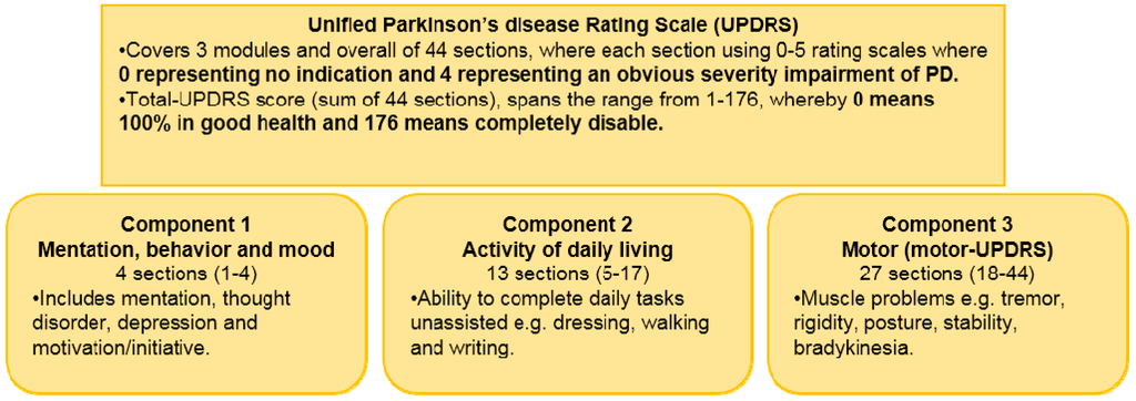 In order to overcome these difficulties and looking for more objective assessment, numerous types of rating scales have been taken into account and applied. This method for PD symptoms monitoring typically requires expert clinical staff to conduct several practical tests and physical examinations. This is linked to the international gold standard reference scale, Unified Parkinson Disease Rating Scale (UPDRS) used by physicians, which reflects the presence and severity of PD symptoms. Figure 3 shows the summary of the clinical rating scale, UPDRS that computes the average PD symptoms severity. Unfortunately, the use of UPDRS brings some boundaries such as intra and inter observer inconsistencies whereby this scale may be too time consuming to administer and it can hardly be applied for continuous registration procedures done in the clinic. Additionally, UPDRS only offers assessment at that particular moment, but the symptoms severity of PWP may fluctuate extensively over the whole day. The motor fluctuation measurements taken during visits to the clinic might not precisely reveal the real functional disability experienced by patients while they are at home [,,]. Prolong period of hospitalization will cause problems for the patient and their family members in term of financial status. Currently, this issue is one of the most demanding difficulties faced with PD as the appropriate medical care is progressively difficult and expensive.