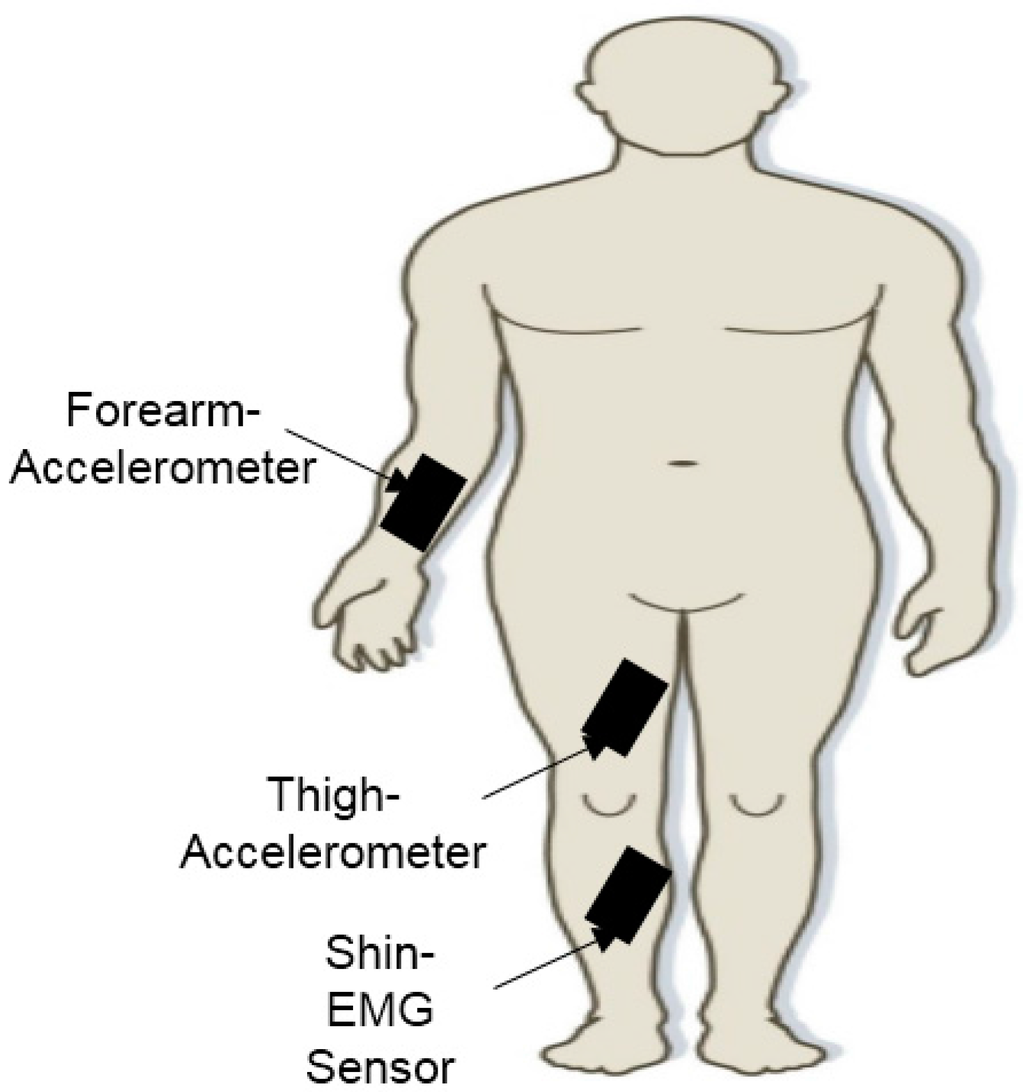 Placement of accelerometer sensors and surface EMG sensor on the subject (adapted from []).