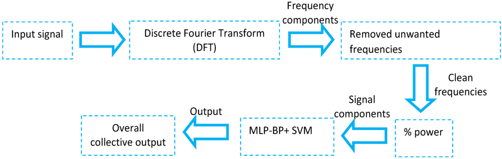 In the latest research, Priyanka G. Bhosale et al. [] had engaged in the grouping of two classifiers: (1) Support Vector Machine (SVM) and (2) Multilayer Perceptron Backpropagation (MLP-BP) for PD detection from the background EEG signals. Figure 5 shows the overall methodology presented in this research. Useful features were extracted by applying the Discrete Fourier Transform (DFT) and the statistical features are then calculated from these clean frequency components using % power formula in order to obtain different frequency bands, which are the inputs for the classification stage. For the classification stage, SVM selects a discriminate hyper plane that maximizes the margins, which is the distances from the nearest training points for class identification. By using SVM, it enables classification with two types of boundaries: linear decision boundaries (linear SVM) or nonlinear decision boundaries using “kernel trick” (e.g., Gaussian SVM, Radial Basis Function (RBF) SVM, etc.). On the other side, MLP is a feed forward artificial neural network model utilizing a supervised learning technique known as backpropagation for training the network. Both classifiers were combined together instead of using a single classifier as SVM provides best training accuracy while MLP provides the best testing accuracy than others. The experimental results had shown that the combination of both classifiers had the capability to make an identification between the two classes of datasets: Healthy or Parkinson’s [].