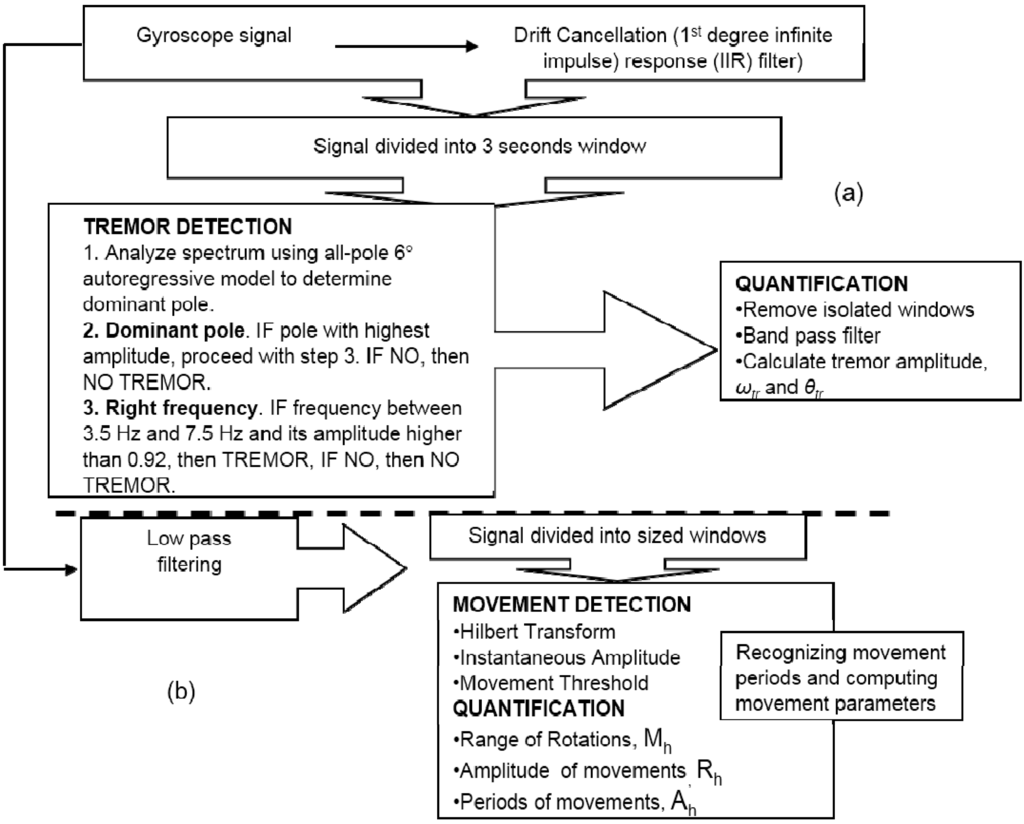 Flowcharts of the techniques. (a) Detection and quantification techniques for tremor; (b) Techniques for bradykinesia quantification.