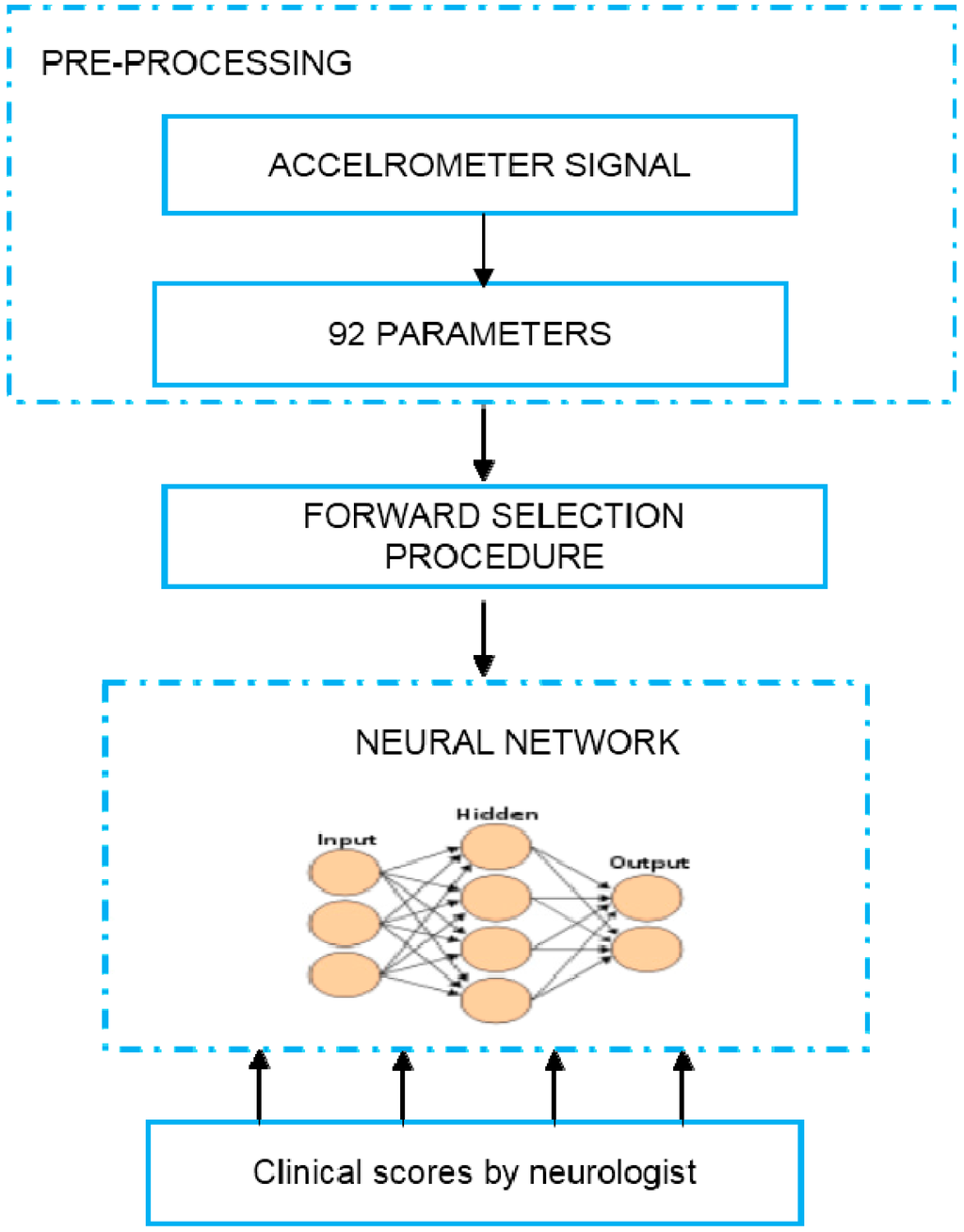 In addition, Keijsers et al. [] also conducted another research that focused on the design of the trained neural network and the role of important features extracted from the raw accelerometer signals, which are used as input variables for an accurate detection and ratings of dyskinesia. The objective of this research was to investigate the performance of an ideal neural network for dyskinesia detection and rating. Table 3 showed the list of parameters used and their description. Figure 7 shows the schematic block diagram of the data preprocessing and successive neural network approach in dyskinesia severity assessment. For every part of the body, the dyskinesia severity might be not similar that made the reason of evaluating it for every body part individually. This is also because the variables required are different for detecting dyskinesia in each body part. The forward selection procedure was used to determine the order of the important parameters and searching for the best features to be used as the input for LID classification. The benefit of this step is that it only includes variables, which bring improved performance without the need of any earlier information and restriction. From the analysis done, the most significant parameter for dyskinesia detection was the percentage of time during trunk/leg movements and standard deviation of less dyskinetic leg segment velocity. The remaining movement features are also significant, but that applies in a different way to other parts of limb segments. For instance, the grouping of percentage of time during wrist movements, and the percentage of time during the subject is in the sitting posture, described the major part of the variance of the output for arm [,,,,].