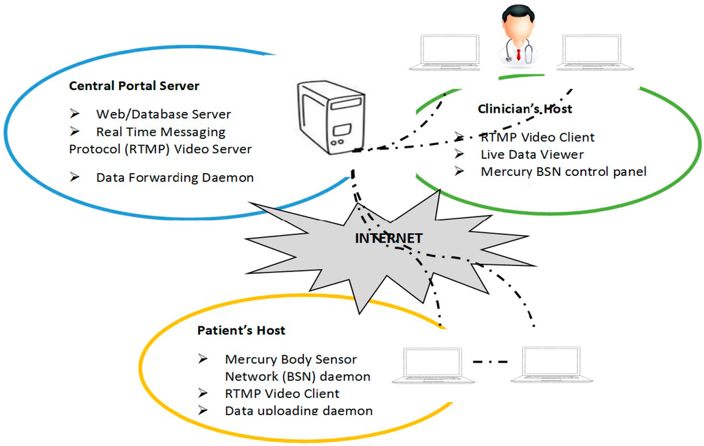 In the following year, Patel et al. [] conducted his research toward the home-monitoring development for PWP who experience severe motor fluctuation using a wireless wearable sensor, whereby information is transmitted to the clinicians through an application using web-based. The implemented home-monitoring system comprises software services, conducting at three tiers: central portal server, patient’s hosts and clinician’s host as shown in Figure 8. The well-provisioned central portal server was in charge of providing a protected and trustworthy central location via coding services in order to coordinate the actual data collection and video services, ensuring data safety and high accessibility of the remote health monitoring service. The patient’s host (laptop) mostly occupies at the particular PD patient’s home and runs the body sensor network (BSN) platform that functions to collect motion data and continual upload motion data to the folder created in the central portal server. Lastly, the clinician’s host occupies in clinic only required Internet access to use the service. Besides that, this system also provides the capability of video interaction between the patients and the clinicians. This research implemented a web-application known as MercuryLive, which comprises a graphical user interface for displaying the motion signals together with the video conference, allowing clinicians for viewing and data annotation throughout every data collection session. Data collection using this developed system will then be processed in order to come out with an estimate of clinical scores that measure the symptom severity and motor complications of PWP using the algorithms for wearable sensor data analysis. In this work, a combination of web-based application together with the technology using the wireless wearable sensor for home monitoring had provided trustworthy quantitative information, which is useful in gathering clinically relevant information for PWP management and also for clinical decision making [].