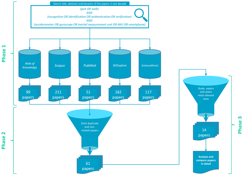 In order to sufficiently identify all corresponding journal papers and proceedings, the following keywords were used to search for their appearance in the title, abstract and keywords of the papers: (gait OR walk) AND (recognition OR identification OR authentication OR verification) AND (accelerometer OR gyroscope OR inertial measurement unit OR IMU OR smartphone). Basically, the searching phrase had to cover three aspects: observed phenomenon (gait or walk), how the observed phenomenon is measured (keywords directly related to inertial sensors) and what we do with measured phenomenon (recognition also covers identification, authentication of verification—Further details on this partition are provided later). Thus, in the first phase of the review process, these keywords were passed to search engines of the following databases and digital libraries (number of discovered papers for a particular database is provided in parentheses): Web of Knowledge (99), Scopus (211), PubMed (51), IEEEXplore (182) and ScienceDirect (117). The selection of these specific datasets stems from their significance in the field of engineering, as well as in biomechanics, medicine, biometry and security.