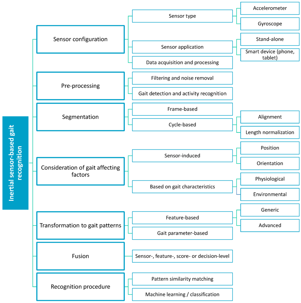 Detailed specification of sensors used in the recent approaches that serve as representative studies in the review process are shown in Table 1. As already mentioned, inertial data during gait is usually acquired by two types of sensor: accelerometers and gyroscopes. As expected, majority of approaches relies on accelerometer data, since gait dynamics is well-reflected in measured accelerations. On the other side, there were same attempts to perform gait recognition based solely on angular velocities [42,45,47] resulting in lower recognition performance when compared with the accelerometer-based recognition. However, major contribution of gyroscopes is in their combination with accelerometers (as IMU) either applied to compensate orientation errors or to perform fused recognition, as explained in Section 4.7 in more detail. Typical measuring range of accelerations used for gait recognition is between ±2 g and ±8 g, while angular velocities measured by gyroscopes are usually in the range between /s up to /s. Concerning reported resolutions, inertial data is digitalised by A/D converters typically within the interval from 8 to 12 bit.