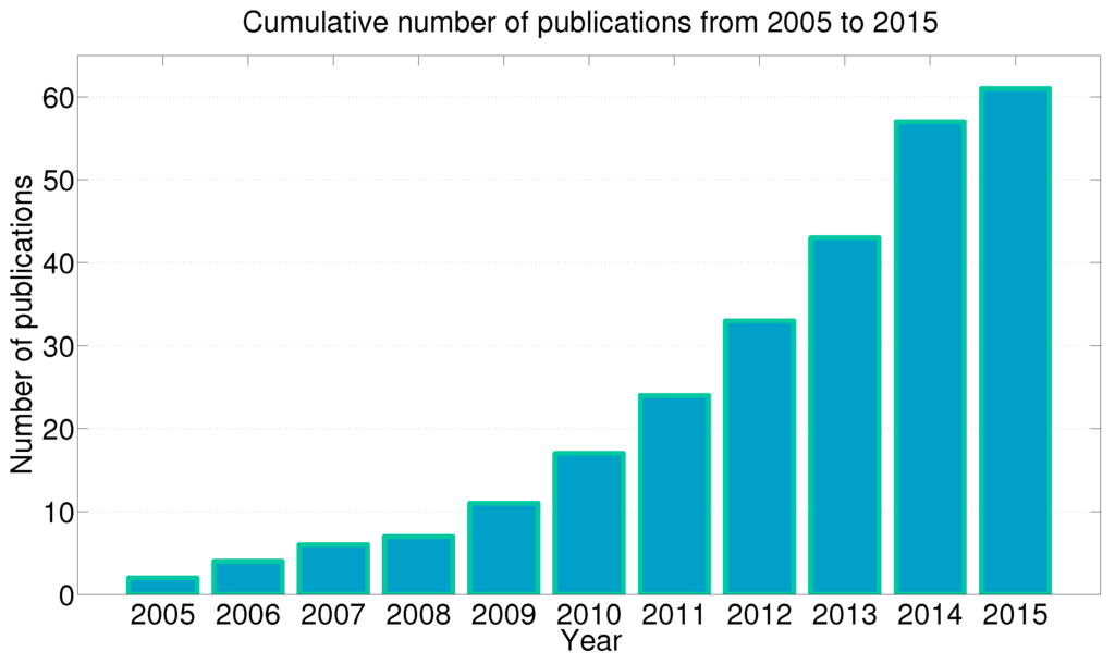 Most recent publications in the field of inertial sensor-based gait recognition indicate that research activities in this field are on the rise. This can be confirmed by Figure 4 which shows cumulative number of publications in last decade where all correspond to the references used in this review paper (please note that for 2015 only the first half of year is considered). It can be concluded that inclination in the number of papers is tightly connected with the popularity and wide usability of inertial sensors, especially as a significant part of smart devices. These ubiquitous devices hand-in-hand with the willingness of the users for their frequent use is a strong foundation for the wide applicability of gait recognition in the practical purposes, implemented either as a stand-alone solution, an additional step by conventional identification or authentication mechanisms or even through the fusion by other biometric approaches in more complex security and surveillance systems.