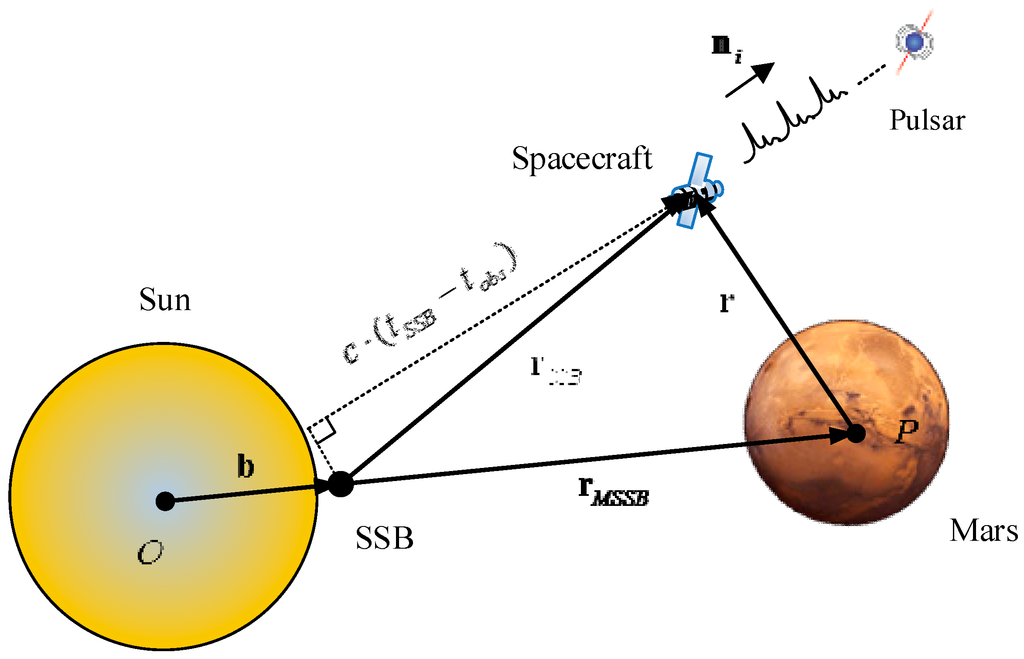 Pulsar signals are pulsed period signals with high stability. At the Solar System Barycenter (SSB), a pulsar phase revolution model is established based on the long-duration pulsar observation, which can be utilized to predict the Time of Arrival (TOA) of pulsar pulses at SSB [26]. By observing the TOA of the pulsar signals and comparing the TOA with the time predicted by the phase prediction model [27,28], one can obtain the position of the spacecraft [7]. As the TOA is observed at the spacecraft, it should transferred to Solar System Barycenter (SSB) [7]. During the time transfer, both the geometric effect and other effects, for example, the relativistic effects, should be taken into account. The principle of the time transfer is indicated in Figure 1, where is the vector pointing from the Sun center to SSB, is the position of the spacecraft relative to SSB, is the position of the Mars center relative to SSB, and is the light-of-sight of pulsar signal for the th observed pulsar. can be calculated by .