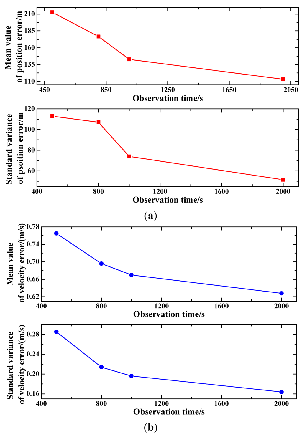 Set the pulsar observation time intervals to be 500 s, 800 s, 1000 s, and 2000 s, respectively, and conduct the filtering of the proposed method under different observation time intervals. Then, the mean values and standard variances of the position and velocity estimation errors are calculated and plotted in Figure 5. Figure 5a presents the impact of observation time intervals on position estimation and Figure 5b is the velocity estimation under different observation time intervals. As shown in Figure 5a, with the increasing pulsar observation time intervals, both the mean and standard variance of the position estimation error decrease. It can also be observed from Figure 5b that the mean value and standard variance of the velocity show a similar tendency with the increasing observation time intervals as that of the position estimation. The reason for the phenomenon is that the noise of the pulsar observation is closely related to the observation time. As pulsar signals are weak, the observed signal is accumulated over a certain duration to strength the pulsar signal. The longer the observation time is, the higher the SNR of the pulsar signal is. Thus, long pulsar observation time could mitigate the observation noise, and consequently improve the performance of the position and velocity estimation.
