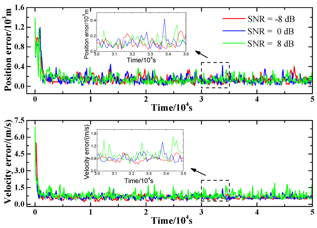 In the simulation, the initial conditions are as follows: (1) the orbit utilizes Orbit 1; (2) the filtering interval is set to 100 s and the pulsar observation interval is set to 1000 s, respectively; (3) SNR of the ranging signal is set to be −8 dB, 0 dB, 8 dB, respectively. Based on the initial conditions, the filtering of the proposed method is conducted, and the results are plotted in Figure 6. As shown in the figure, the influence of SNR of ranging signal on position and velocity estimation is minor. This is because of the differences in level of noises of the pulsar observation and the ranging measurement. The noise level of the range measurement is much lower than that of the pulsar observation. Thus, when the noise of the range measurement is influenced by the variation of the SNR of the ranging signal, the influence of the change in the range measurement noise is minor because the change is small relative to the high level of the pulsar observation noises.