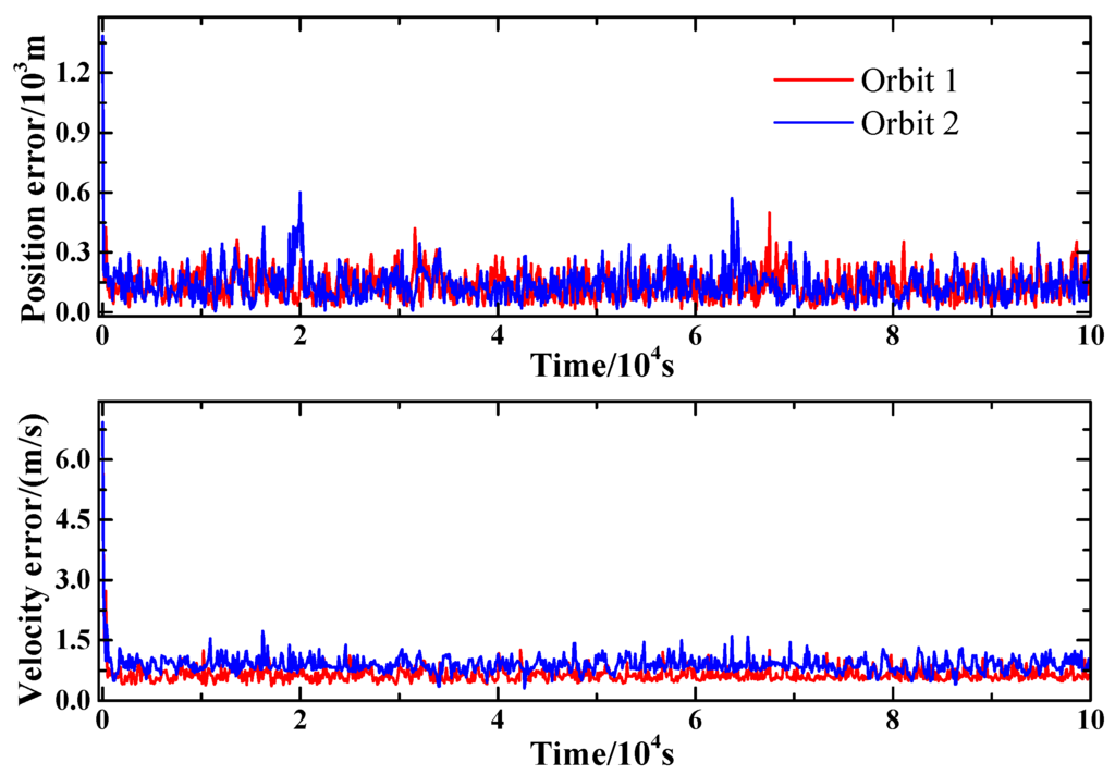 Different Mars orbits are used in this section to analyze the performance of the proposed method. Besides of Orbit 1 introduced in Section 3.1, we introduce another orbit, which is a stationary orbit of Mars. Its parameters are as follows: (1) the orbit is a circular orbit with a radius of 20,429.893717 km; (2) the inclination of the orbit is 0.014°. For simplicity, this orbit is named as “Orbit 2”. Other parameters are set as follows: (1) the filtering interval is set to 100 s and the pulsar observation time is set to 1000 s; (2) The SNR of the ranging signal is set to be 0 dB and the slot duration, , is set to be 1e−7 s; (3) the first two pulsars in Table 1 are utilized for pulsar observation.