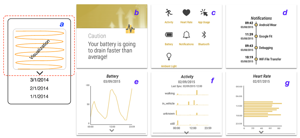 Such a framework requires addressing the limitations discussed above, especially battery constraints. Furthermore, to ensure its wide applicability, it needs to be generic (application-agnostic) and integrated. Its prediction and sensing module should further be independent from the underlying device-specific sensors to ensure that it is flexible and can be used on models from different manufacturers and by different types of wearable applications. According to Rehman et al. [15], there are three classes of information sources: device-specific, operating system-specific and user-specific information. Our work focuses on user-specific information, although the distinction is somewhat blurred for some aspects. For example, battery performance could be considered both device-specific, as well as user-specific information, since it is valuable for the user to have an awareness and overview of this type of information.
