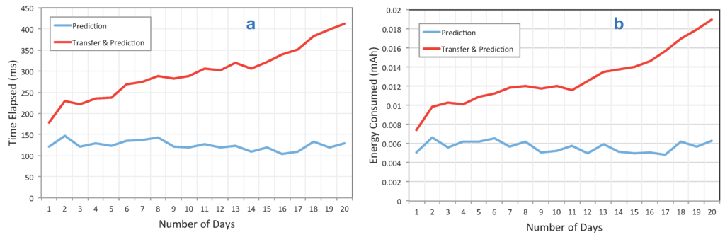 As has been stated previously, a prediction or any other reasoning component that runs on small devices must be light enough to handle the limited computing capabilities of these devices. Moreover, we found in one of our experiments (Section 5.3.1) that transferring data from a wearable device is a resource-consuming process. Therefore, a prediction component is useful if it performs the reasoning on the device and thus allows relevant applications to instantaneously benefit from its predictions. Most wearable applications, such as health monitoring, require instant decision making [15]. On the other hand, there are several approaches that benefit from uploaded data and conduct these analysis either offline [17,45] or in the cloud and subsequently stream back the result [16]. Even new approaches for wearable data analysis, which are application specific, are performed on the smartphone [46] and not the wearable device itself. Even though outsourcing data analysis to a remote system is easier from a development perspective, this approach would require a connection to the cloud and causes a significant network overhead on the target application, as well as privacy issues.