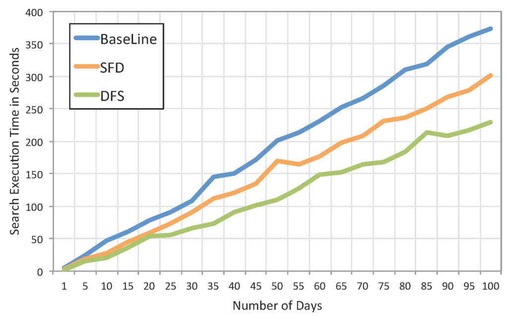 Figure 10 shows differences between the three strategies. Separating sensors yields better performance rates, as this strategy reduces the search space. Therefore, SFD and DFS both outperform the baseline strategy. As shown in Figure 10, increasing the number of days increases the search execution time. For instance, for 100 days of data, which is about only three months of data, the experiments show 144-s differences between the baseline and SFD. This means that SFD is the most efficient file structure for data storage in our framework.