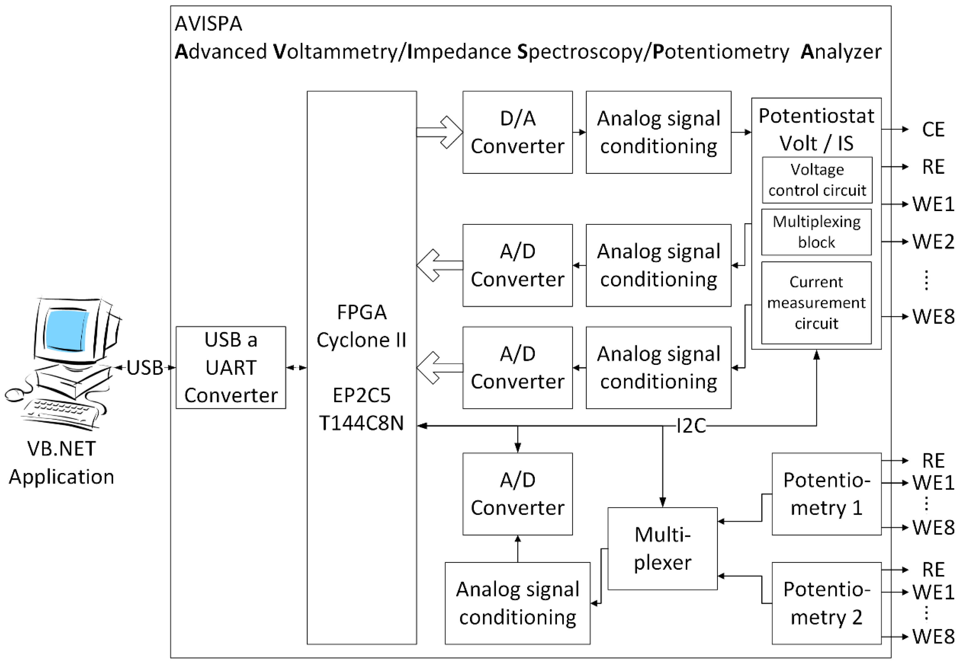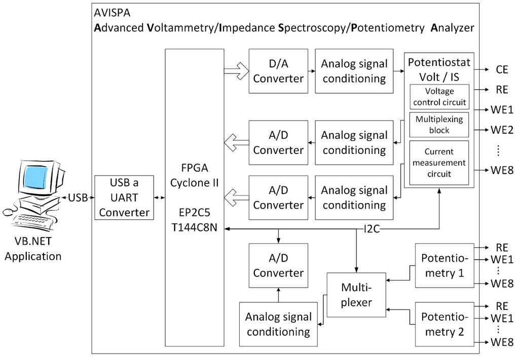 EIS measurements were carried out using a system developed by the Group of Electronic Development and Printed Sensors (GED + PS) belonging to the Centro de Reconocimiento Molecular y Desarrollo Tecnológico (IDM) at the Universitat Politècnica de València (UPV). This system consists of a device called AVISPA (Advanced Voltammetry, Impedance Spectroscopy & Potentiometry Analyzer) (Figure 1) associated with a specific software application that is able to apply different sinusoidal voltage signals with amplitudes up to 1 Vpp and frequency sweep from 0.01 Hz to 10 MHz using up to 32 current scales. The hardware consists of an Altera Cyclone II EP2C5T144C8N Field Programmable Gate Array (FPGA), clocked at 100 MHz, a 12-bit THS5661A Digital-to-Analog Converter (DAC), two identical ADS6125 12-bit Analog-to-Digital Converters (ADC), and various analog blocks to adapt signals to the required levels. It also contains hardware to be able to select 32 current scales, by means of various shunt resistors, to increase the sensitivity of the current measurement.