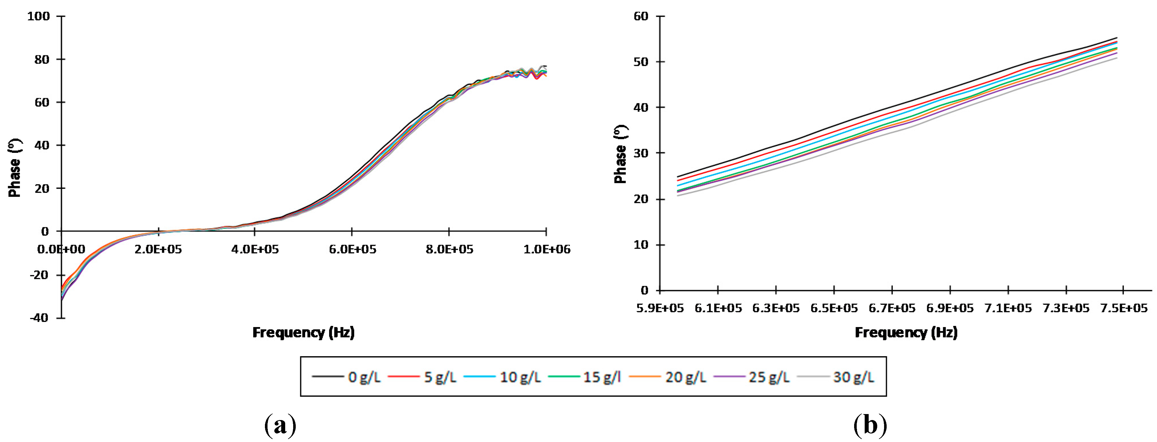 Averaged phase values of the impedance spectra of different sucrose concentration measurements for (a) the entire analyzed frequency range and (b) the selected range for data treatment (5.96 × 105 Hz–7.47 × 105 Hz).