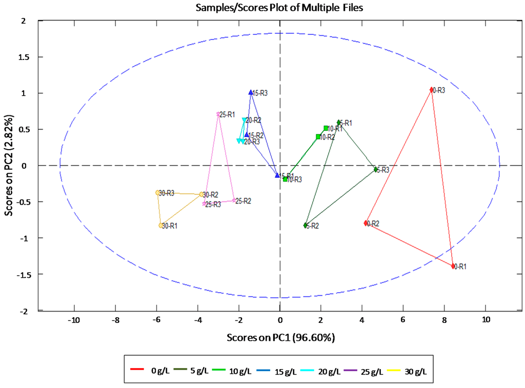 Principal component analysis (PCA) for the studied sucrose concentrations. R1–3: average of each replicate. The blue ellipsis indicates 95% confidence level.