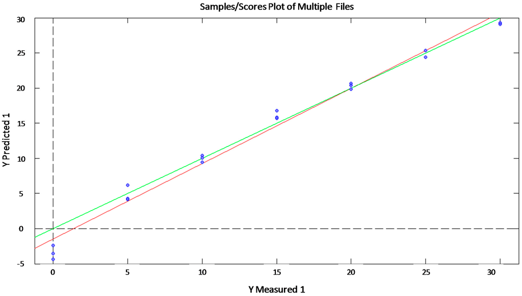 Next, PLS analyses were performed to generate a mathematical model able to predict concentrations of combined fermentable sugars. In order to do this, different PLS were conducted to check the capability of the system to detect and quantify each fermentable sugar from different mixtures of sugars in pineapple waste samples. The obtained results (R2 > 0.841 RMSEP < 8.23) indicate that PLS modeling for the combination of fermentable sugars is slightly lower than the ones shown in the previous cases. However, these results are not far from those obtained in other scientific studies in similar fields [39,41].