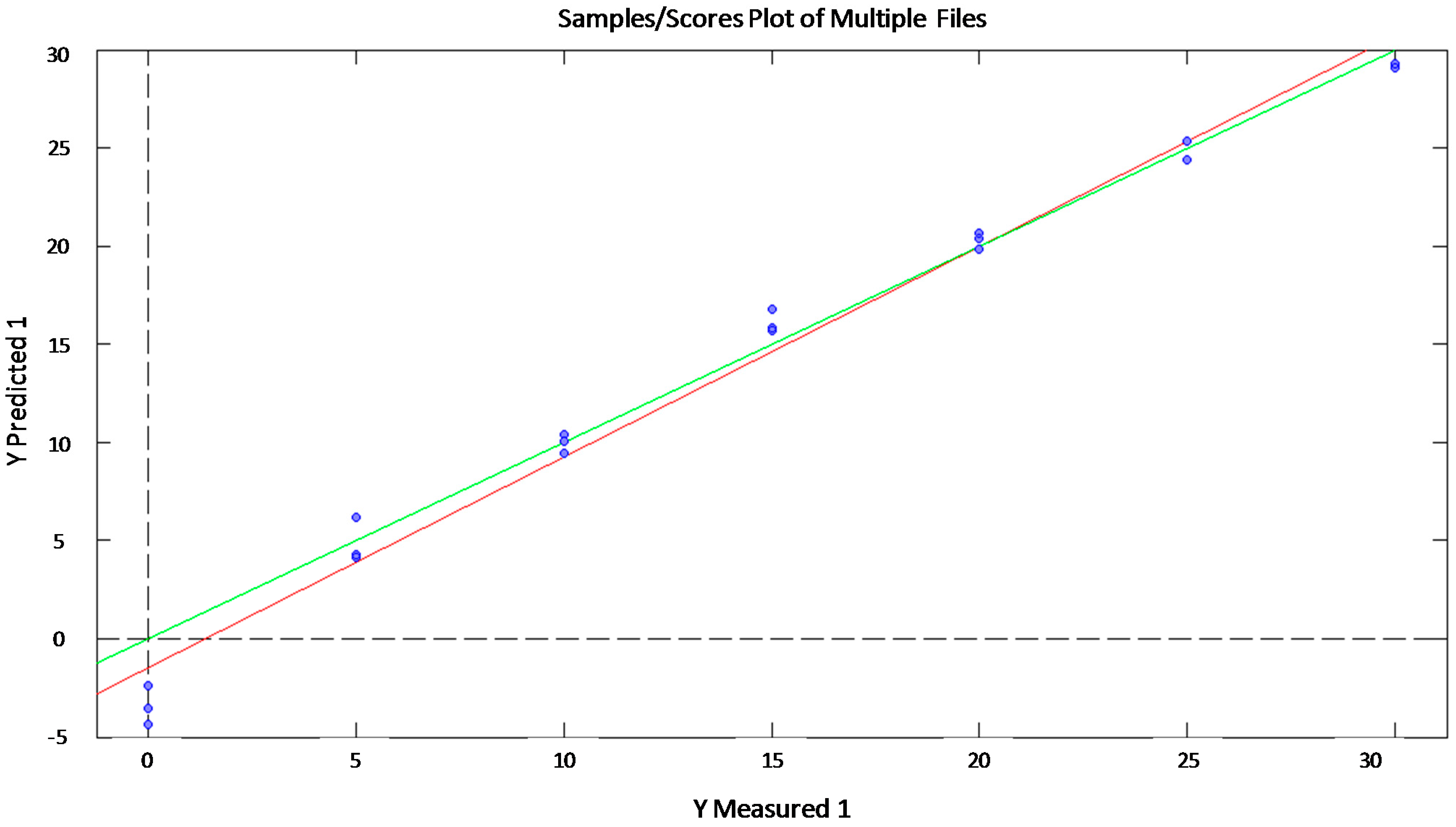 Correlation plot between experimental and predicted values of sucrose (g/L) by PLS statistical model (red line) and ideal behavior (green line).