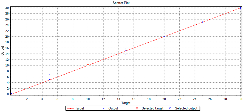 However, as an alternative method to PLS analyses, Artificial Neural Networks-based models (ANN) were designed using the same data set. In order to do this, different net architectures were tested for each analyzed sugar to optimize the fitting between the EIS data and the expected response. Thus, a (16-8-1) architecture was designed for glucose that means 16 input nodes connected to an 8-node hidden layer and a final output layer. For fructose and sucrose, (16-21-1) and (16-2-1) architectures were selected. The training phase of these ANN generated mathematical models that are summarized in Table 2. The obtained models showed determination coefficients higher than 0.95 and RMSEP lower than 3.96. Figure 6 shows the regression line obtained by ANN for sucrose. These results demonstrate that the designed ANN model generates noticeable results with sufficient accuracy and reliability for modeling sugar concentration depending on the EIS response.