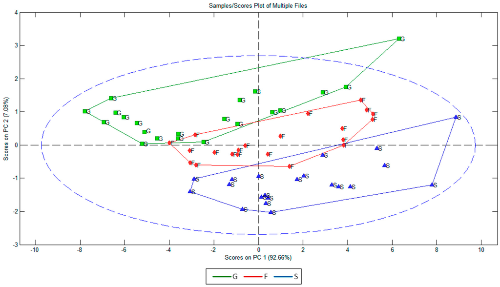 Principal component analysis (PCA) for the studied fermentable sugars: glucose (G), fructose (F) and sucrose (S).