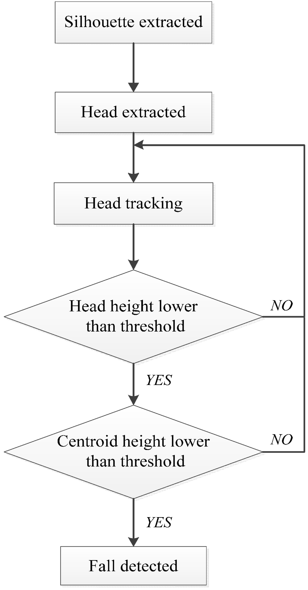 When a person first appears in the scene, the head position will be extracted and tracked, and a sequence of the head height can be calculated which is marked as H_head. Then, 0.25*H_head1 is used as the threshold, which is suggested by reference [22], where H_head1 is the first value of the head height that has been calculated. The dynamic threshold made the method adaptive to persons with different heights. If the head height in the tracking process is lower than the threshold, the centroid height H_centroid will be used as the second judgment. If head height is not lower than the threshold, the centroid position and centroid height will not be extracted and calculated. This judgment policy can reduce the complexity of the algorithm to a great degree. When the head height and the centroid height are both lower than the threshold at the same time, a fall accident can be determined.