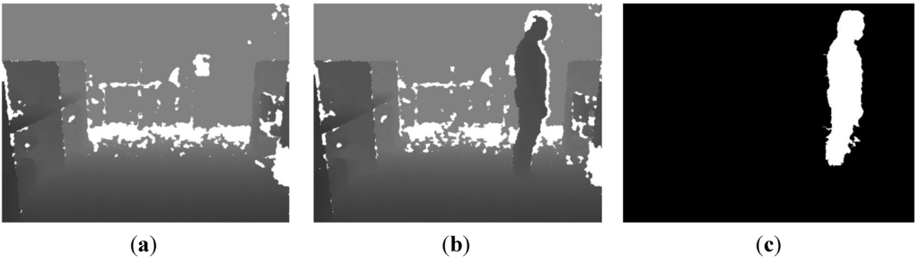 Extraction of human silhouette. (a) Background depth frame; (b) foreground depth frame; (c) extracted human silhouette.