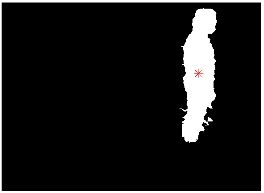 where f(x,y) is equal to 1 in the silhouette area and 0 in background area, correspondingly. The centroid position of Figure 2c is marked by a red asterisk in Figure 3.