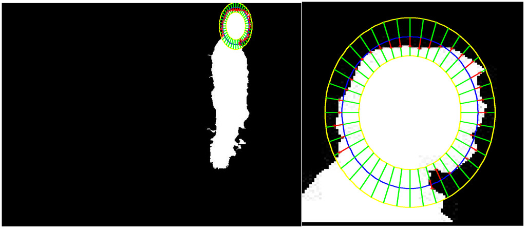 In order to extract the head position, the ellipses are used to find the foreground coefficient by searching for silhouette contour points [20]. In the algorithm, there are three ellipses: the central ellipse is defined by parameters a and b, the inner ellipse is defined by parameters 3a/4 and 3b/4, and the outer ellipse is defined by parameters 5a/4 and 5b/4. In order to compute the foreground coefficient, 40 normal segments of the central ellipse’s contour were used, which started on the inner ellipse and ended on the outer ellipse. It is clear that the foreground coefficient will obtain the maximum value when the central ellipse is fitted with the head edge.