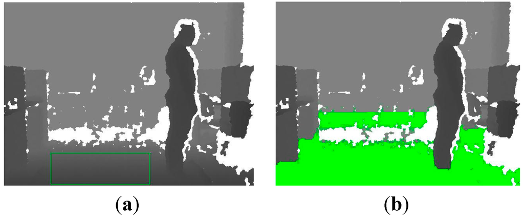 In our algorithm, the least squares method is used to obtain coefficients after choosing the definite floor area. The depth points can defined as (Xi,Yi,Zi), where Xi,Yi and Zi are depth points’ coordinates in the real world. As the depth points’ coordinates have been determined, the floor plane equation can be described as AX + BY + CZ = 1. Then Equation (11) is satisfied for these depth points.