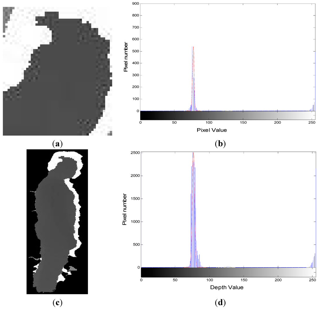 Histogram of head and human in depth images. (a) Head depth image; (b) histogram of head in depth image; (c) human subject depth image; (d) histogram of human subject depth image.