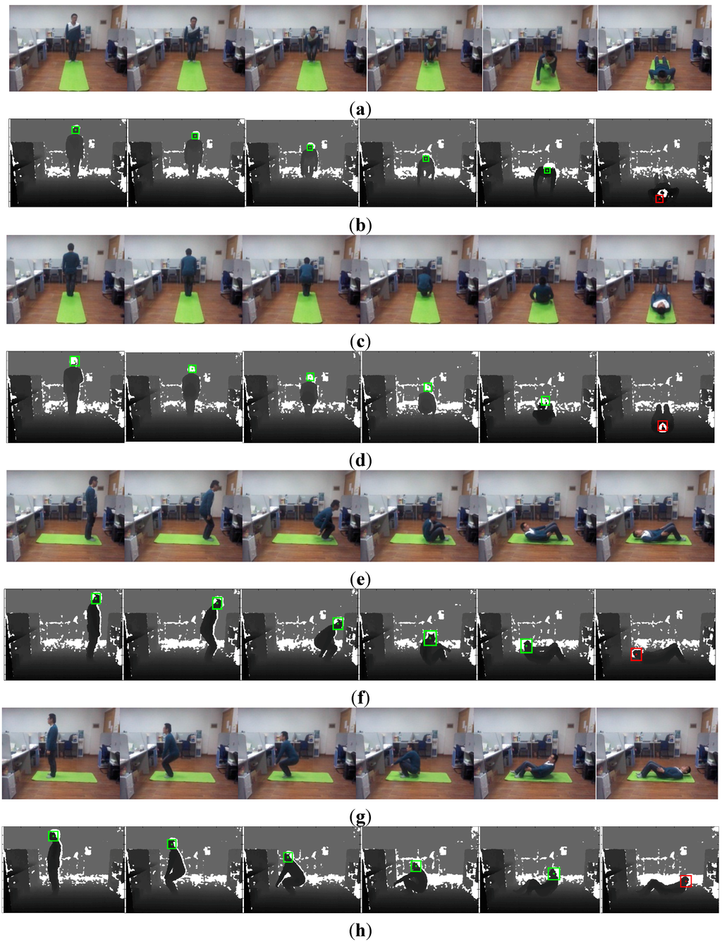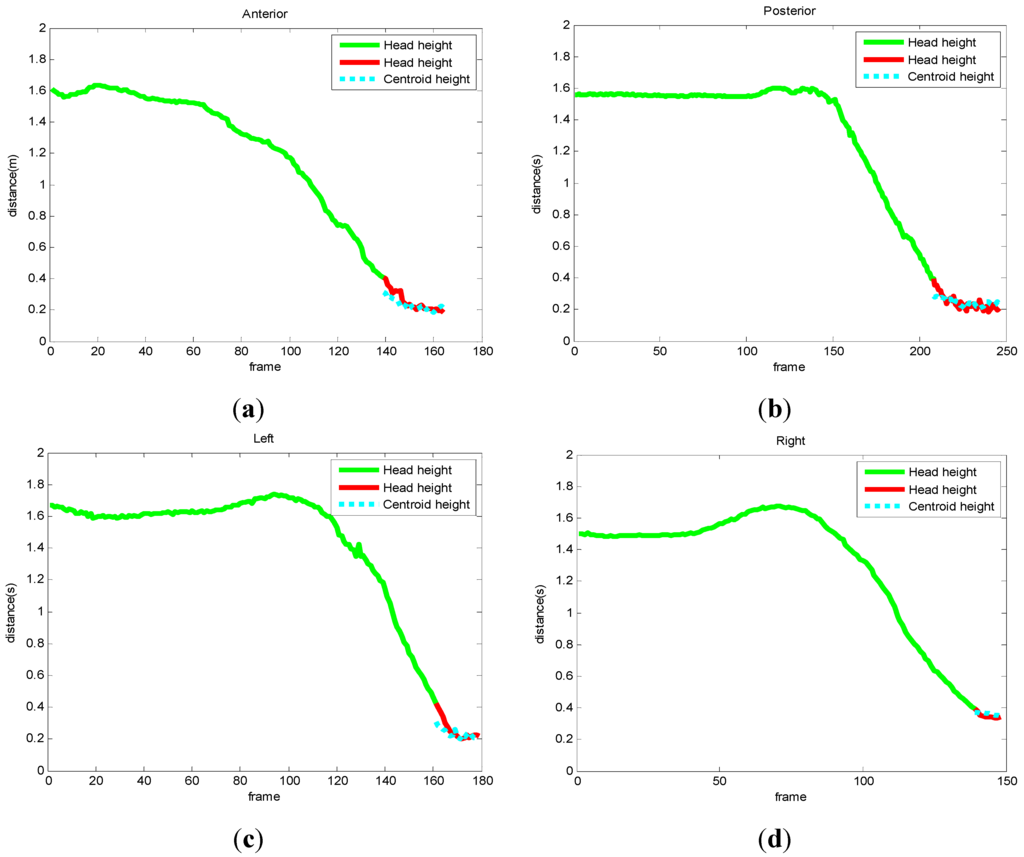 Some examples of falls in four different orientations are anterior, posterior, left, and right, as shown in Figure 7. Figure 7a,c,e,g are frames of color images of falling down in four directions, and Figure 7b,d,f,h are frames of depth images of falling down in four directions at the same time. In the first frame of each sequence, the head positions have been extracted by the method shown in Section 3.2 and the threshold can be calculated. The head positions of participants are marked by a green bounding box and the centers of the rectangle are marked by a green asterisk. In the following frames, the head positions are tracked and the distances from the head to the floor plane are computed and compared with the threshold. As long as the distance is lower than the threshold, the distance from the centroid of the human to the floor plane will be used as the second judgment. When the double distances are both lower than the threshold, the participant will be detected as falling. In the last row of each sequence, the fall has been detected and the head position is marked by a red bounding box and a red asterisk. The trajectories of the distances from the head and centroid to the floor plane are shown in Figure 8. Correspondingly, only when the fall has been detected the distance is marked from green to red.