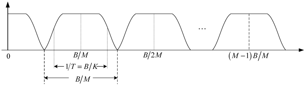 where denotes the symbol interval after up-sampling and denotes the time domain response of the transmit filter . To obtain the highest spectrum efficiency, the transmit filter should be an ideal low-pass filter. However, since the ideal low-pass filter cannot be achieved, in fact, the transmit filter must be designed to strike a balance between the implementation complexity and the spectral containment [28,33]. In the proposed method, we follow the transmit filter design scheme proposed by Wilbur et al. [28] which selects the root raised cosine (RRC) shaping filter for transmit filtering. Figure 2 shows the complex baseband spectrum of the transmit FMT signal when the RRC shaping filter is used. Referring to Figure 2, the entire band B is divide into M subcarriers, the occupying bandwidth of each subcarrier is , the effective bandwidth of each subcarrier is , and the roll-off factor of the RRC shaping filter is . Since must be in the range of , can change from to for a given to compromise between ICI/ISI sensitivity and the symbol rate. Figure 2 indicates that since the maximum side-lobe peak of the transmit filter in the FMT modulator is designed very close to zero in practice, the effect of ICI can be neglected in the stable acoustic channel. Furthermore, since the subcarriers in FMT have relatively wide bandwidth, ICI also is a minor concern compared with ISI in the acoustic channel with realistic Doppler shift.