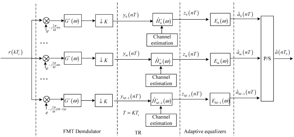 Figure 3 shows the block diagram for the receive structure based on baseband model. Referring to Figure 3, it is observed that the FMT demodulator is composed of subcarrier demodulators, receive filters and K-times down-samplers. The m-th output signal of the FMT demodulator can be expressed as: