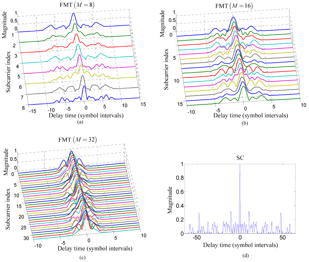 Figure 4 compares the time domain response of each composite channel from the transmit filter to the matched filter for the TR process between the proposed method and the TR acoustic communication using SC modulation. It is noticed that the span of ISI in each composite channel is reduced using the proposed method compared with the TR acoustic communication using SC modulation and, moreover, the span of ISI decreases with the increasing number of subcarriers. However, the larger number of subcarriers leads to the smaller bandwidth of each subcarrier which demands the longer transmit filter with more complicated implementation for the purpose of maintaining high spectral containment. Therefore, in practice, the number of subcarriers in FMT cannot increase indefinitely and should be selected in consideration of maintaining high ISI suppression and relatively low implementation complexity of the transmit filter.