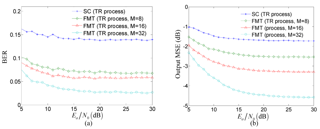 Several observations can be made from Figure 5. Firstly, the BER and output MSE of the TR process in the proposed method is obviously lower than that in the TR acoustic communication using SC modulation under the same . The reason for this observation is that compared with the TR acoustic communication using SC modulation, the proposed method can reduce the effect of ISI through exploiting FMT to decrease the ISI span of composite channel shown in Figure 4. Therefore, when the effect of noise is the same, the performance of the TR processing in the proposed method is superior to that in the TR acoustic communication using SC modulation. Secondly, the BER and output MSE of the TR process in the proposed method decrease when the number of subcarriers increases under the same . The reason for this observation is that in the proposed method, the ISI span of composite channel decreases with the increasing number of subcarriers. Therefore, the performance of the proposed method increased with the decreasing effect of ISI when the effect of noise is same. Thirdly, when , the BER and output MSE of the TR process in two communication methods both tends toward saturation. The reason for this observation is that when the effect of noise can be neglected due to the high value of , the effect of ISI determined by the ISI span in composite channel shown in Figure 4 is the major factor influencing the performance. Therefore, the performance of the TR process in two communication methods both tends toward saturation as the result of high and fixed ISI span in composite channel for the same number of subcarriers, .