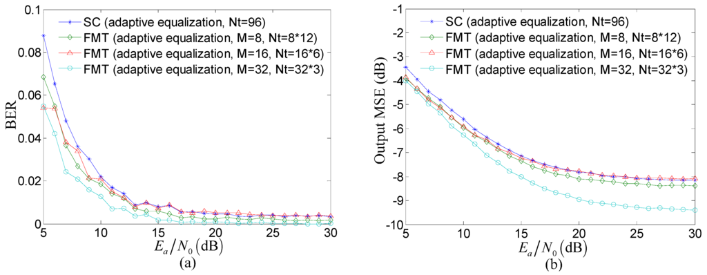 Several observations can be made from Figure 6. Firstly, the performance is further improved using adaptive equalization as post-process after the TR process. Secondly, when and the total number of taps are equal, the performance of adaptive equalization in the proposed method individually for , , and is very close to that of the TR acoustic communication using SC modulation except that the output MSE of the proposed method for is reduced by . Thirdly, although the total number of taps is equal, each adaptive equalizer in the proposed method is adjusted individually and therefore the computational complexity of adaptive equalization can be reduced using the proposed method compared with the TR acoustic communication using SC modulation. For RLS algorithm used in the simulation, the multiplication computation of each interaction in the TR acoustic communication using SC modulation is . The multiplication computation of each interaction in proposed method individually for , , and is , , and . That is to say, the computational complexity of adaptive equalization for , , and is respectively cut by 7/8, 15/16, and 31/32 in the proposed method.