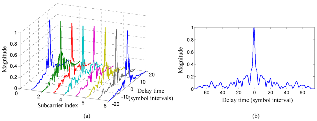 It is indicated from Equations (4) and (8) that since the response of each filter for the TR process is matched to the estimated response of channel for each subcarrier, ISI can be compressed using the TR process. However, it should be mentioned that since the frequency domain response of the m-th filter for the TR process is but not , residual ISI is still existing even when the channel is estimated without any error. Residual ISI reduces the performance of the TR process.