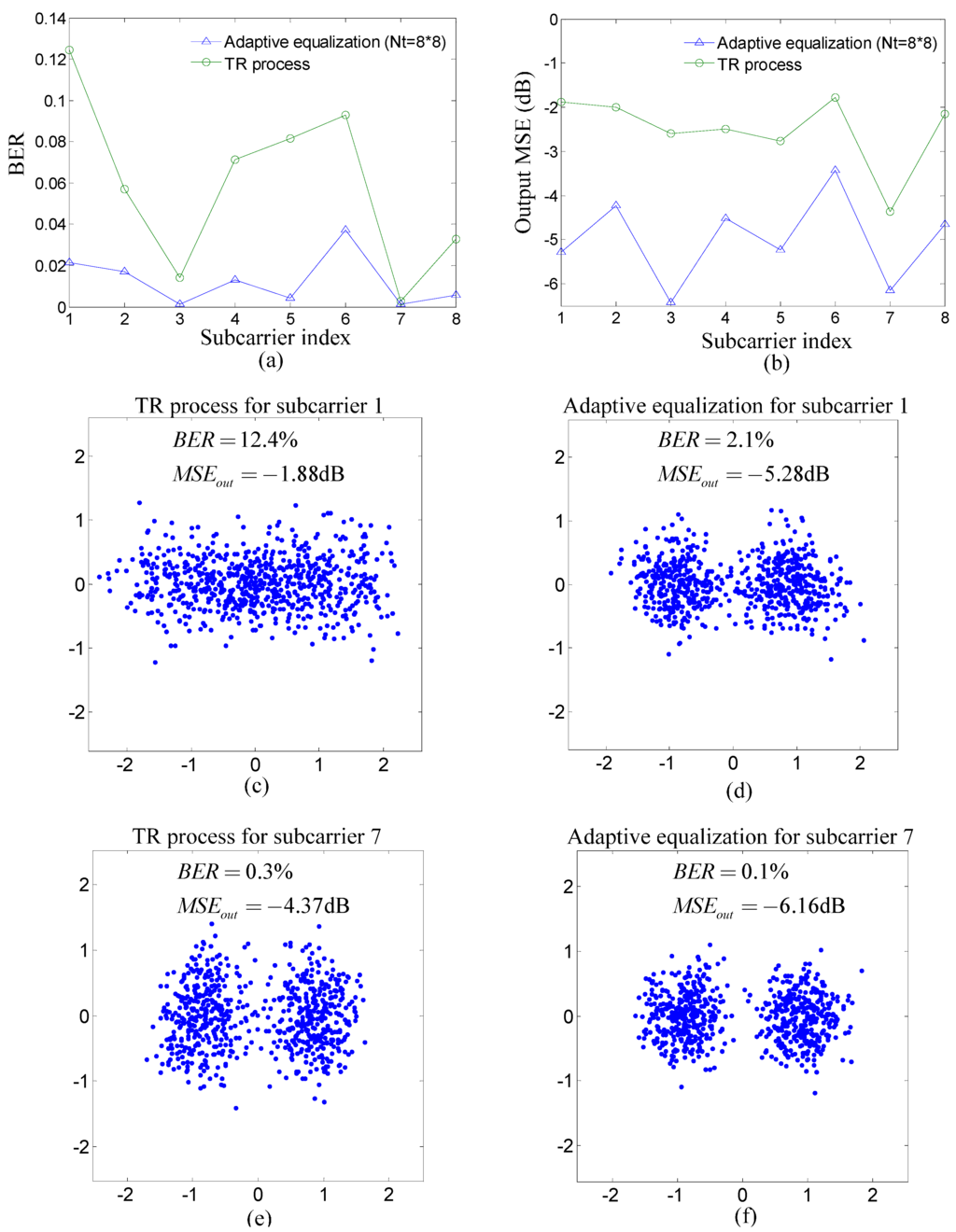 Experiment results for each subcarrier of the proposed method: (a) BER of the TR process and adaptive equalization; (b) output MSE of the TR process and adaptive equalization; (c,d) scatterplots of the TR process and adaptive equalization for subcarrier one; and (e,f) scatterplots of the TR process and adaptive equalization for subcarrier seven.