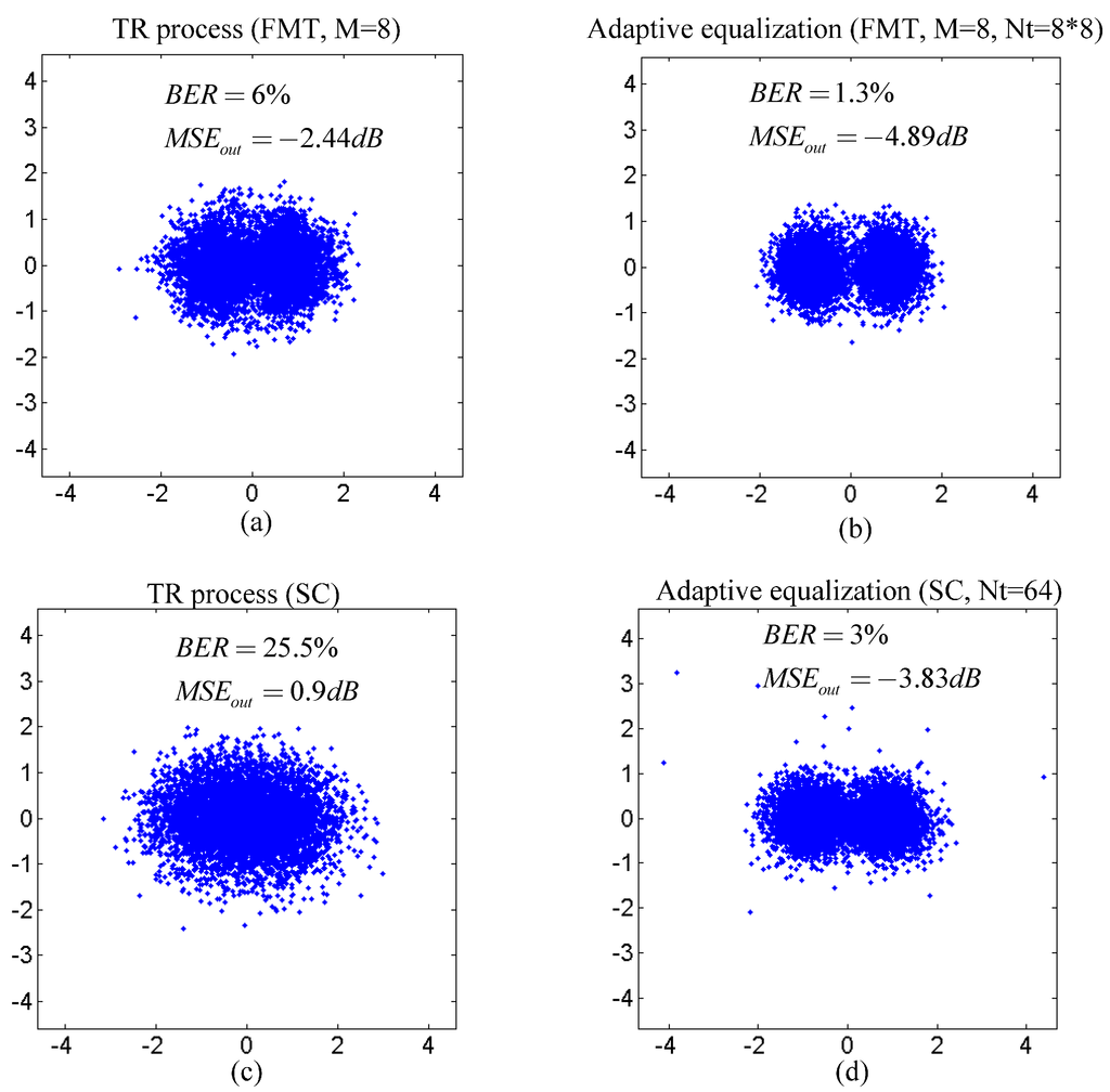 Figure 9 summarizes experiment results for each subcarrier of the proposed method. The first row of Figure 9 shows the performance of the TR process and adaptive equalization for each subcarrier where BER and the output MSE are used as performance indicators. It is noticed that the BER of the TR process for subcarrier one is the highest and that of subcarrier seven is the lowest. To demonstrate performance visually, the scatterplots for subcarriers one and seven are shown in the second row and the third row of Figure 9. The dots in each scatterplot denote the output symbols of the TR process or adaptive equalization, which should locate at −1 and 1 for BPSK without noise and ISI. Therefore, the scatterplots in Figure 9 further confirm that the performance of subcarrier seven is better than that of subcarrier one.