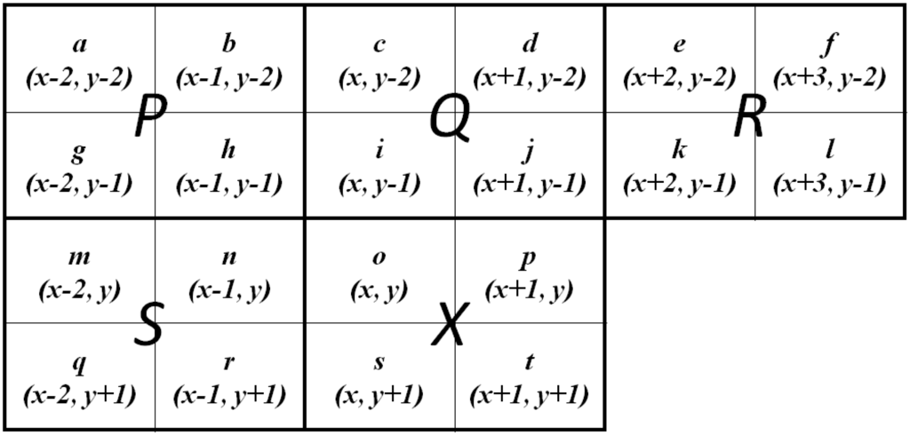 Pixels a to t denote the location, text, and meaning from (x − 2, y − 2) to (x + 1, y + 1) of each pixel in the image. Blocks P, Q, R, S, and X denote the location, text, and meaning of the four pixels as a group: (a, b, g, h), (c, d, i, j), (e, f, k, l), (m, n, q, r), and (o, p, s, t), respectively. In the first-scan method of the BBDT algorithm, 16 pixels are selected (pixels a, f, l, and q are excluded, as judgments regarding these can be made using the other pixels in each block). The OR-decision table and decision tree of the 16 pixels are also constructed for each judgment to determine the neighbor operations. The BBDT algorithm uses three equivalence arrays to save the neighbor relationship of each provisional label, much like the two-scan pixel-based labeling algorithm described in [10]. The arrays are used to save and combine label-equivalent sets. The minimal label in the equivalence is called the “representative label,” and is used to update provisional labels when the relevant groups have the common relationship of eight-connectivity.