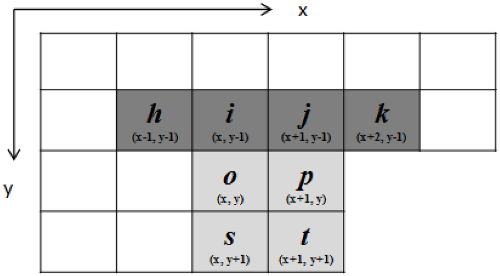 In this paper, we focus on the eight-connected relationship in labeling algorithms. Before introducing the proposed algorithm, an introduction to the relevant terminology is given using related work in the area. Let f(x, y) denote the pixel location in an image of resolution W × H, where 1 ≦ x ≦ W and 1 ≦ y ≦ H. The foreground and background pixels of an image are denoted by 1 and 0, respectively. The improved larger scan mask for the pixel-based labeling algorithm with optimized binary decision trees, called the block-based decision table (BBDT), was proposed by Grana et al. [12]. The larger scan mask is called the “block-based scan mask,” and includes 20 pixels grouped into four pixels per block. The block is thus a 2 × 2 pixel grid. The BBDT algorithm moves over the 2 × 2 grid using five blocks, as shown in Figure 1. To collect the subsets of foreground pixels with eight-connected neighbor relationships, the BBDT algorithm scans an image twice during the labeling task. In its first-scan method, the BBDT algorithm assigns provisional labels to the foreground pixels, and saves the label equivalences for all subsets in three equivalent arrays. Each judgment of the block-based scan mask considers neighbor operations depending on the state of the neighboring pixels, and follows the decision trees. The number of provisional labels created is reduced by a factor of four. This leads to the generation of subsets in the block-based labeling algorithm. A smaller number of subsets implies fewer neighboring operations and shorter processing time for merge decisions. Having processed label equivalences over an image, the second-scan method is used to update all provisional labels to representative labels using three equivalent arrays.