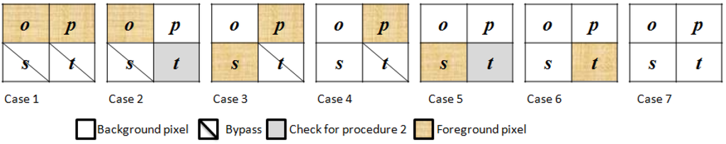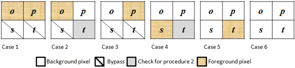 When pixels n and r are both background pixels, the proposed algorithm chooses procedure 1 to determine the action for the current block X. Procedure 1 is designed to judge the block-connected relationships between block X and blocks P, Q, and R. The state of pixels n and r indicates the existence of block S. Thus, block S has no connection with block X. Block X then considers fewer block-connected relationships, which enhances the performance of labeling tasks. For procedure 1, the proposed algorithm sequentially checks the pixels of block X against pixels o to t. According to the values of the four pixels in the current block, there are 16 cases for pixels o, p, s, and t, which are denoted in binary digits as (opst)2. (opst)2 ranges from (0000)2, (0001)2, (0010)2 … to (1111)2. The proposed algorithm uses six cases, and simplifies the 10 redundant cases using the binary decision trees of procedure 1. The six cases can determine the final action for the current block depending on the binary number (hijk)2 of pixels h, i, j, and k by following the binary decision tree. (hijk)2 ranges from (0000)2, (0001)2, (0010)2 … to (1111)2. The six cases of procedure 1 in the proposed algorithm are summarized in Figure 3.
