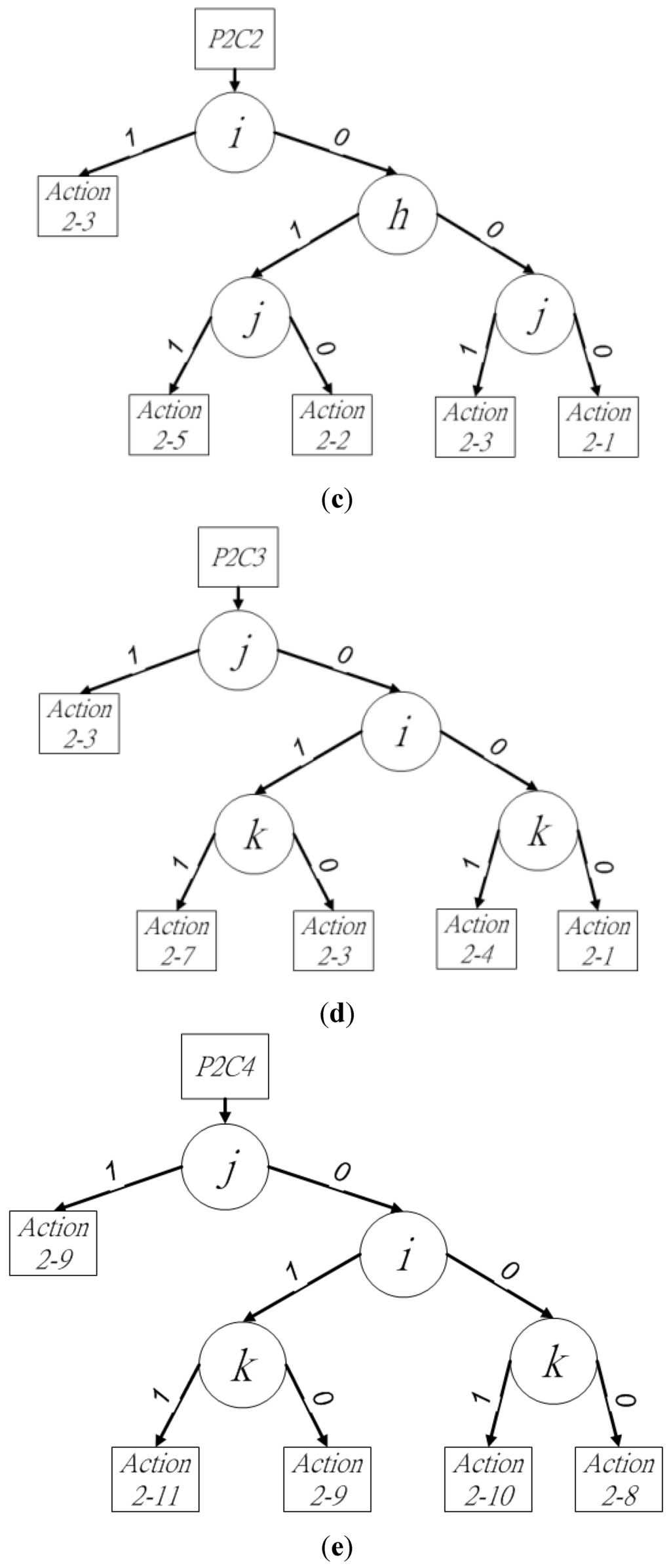 Binary decision tree of (a) procedure 2, (b) P2C1, (c) P2C2, (d) P2C3, and (e) P2C4.